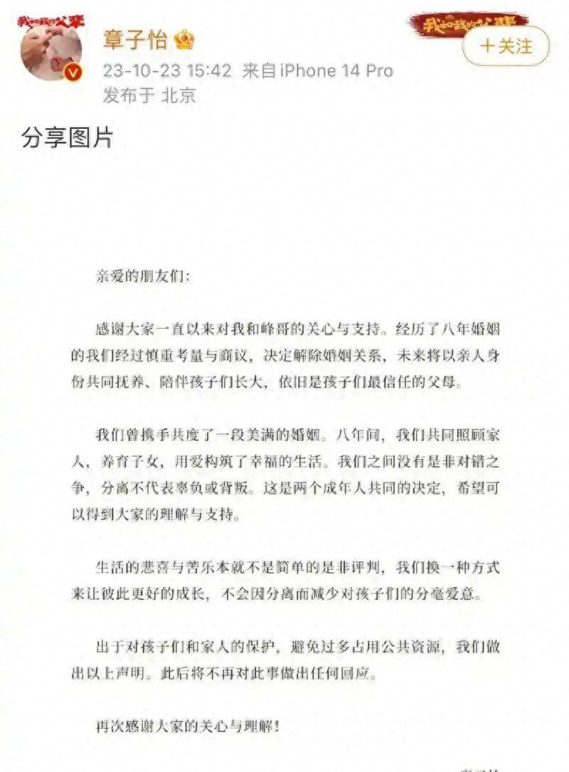 2023年她和汪峰宣布离婚,声明里没吵没骂,只说了谢谢,很多人没想到,毕竟娱乐圈离婚多半闹得不可开交,离婚后孩子归汪峰带,她每周都去陪醒醒过周末,也出现在圆圆生日的全家福里,汪峰带新女友上综艺,她只说了一句,祝他过得好。